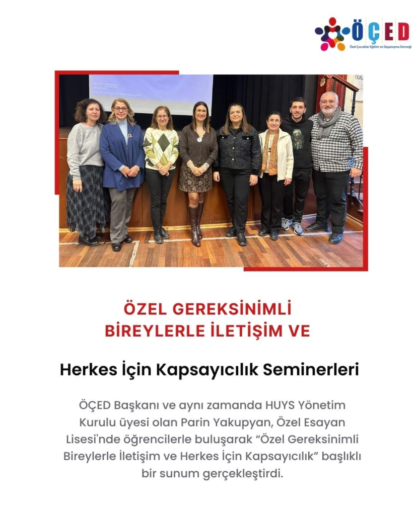 ÖÇED Başkanı HUYS Yönetim Kurulu üyesi Parin Yakupyan, Özel Esayan Lisesi’nde öğrencilerle buluşarak “Özel Gereksinimli Bireylerle İletişim ve Herkes İçin Kapsayıcılık” başlıklı bir sunum gerçekleştirdi.