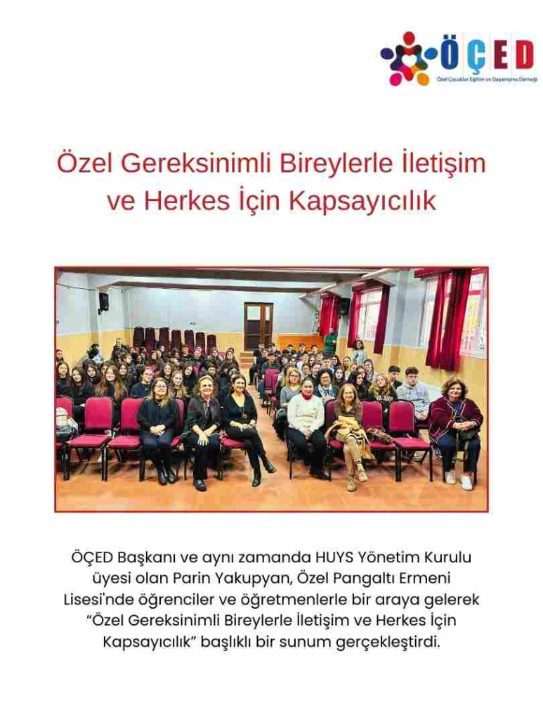 ÖÇED Başkanı ve aynı zamanda HUYS Yönetim Kurulu üyesi olan Parin Yakupyan, Özel Pangaltı Ermeni Lisesi’nde öğrenciler ve öğretmenlerle bir araya gelerek “Özel Gereksinimli Bireylerle İletişim ve Herkes İçin Kapsayıcılık” başlıklı bir sunum gerçekleştirdi.